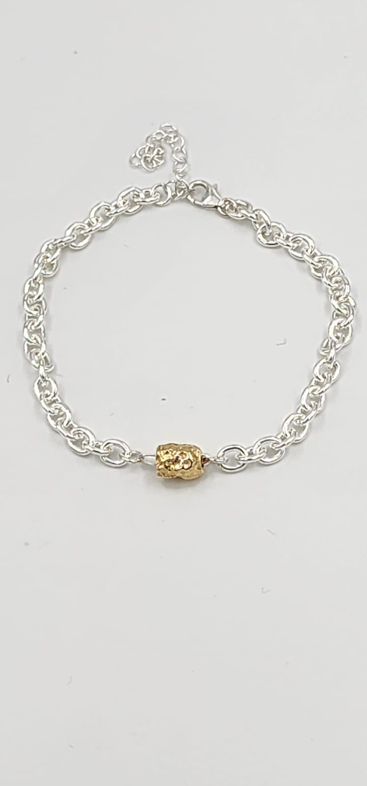 צמיד נקודת זהב הוא תכשיט עדין ומדויק, המשלב קלאסיות עם טוויסט אומנותי. הצמיד עשוי כסף בעיצוב שרשרת אלגנטית ועל-זמנית, ובמרכזו אלמנט זהב קטן בציפוי 14k עם טקסטורה אורגנית טבעית.
